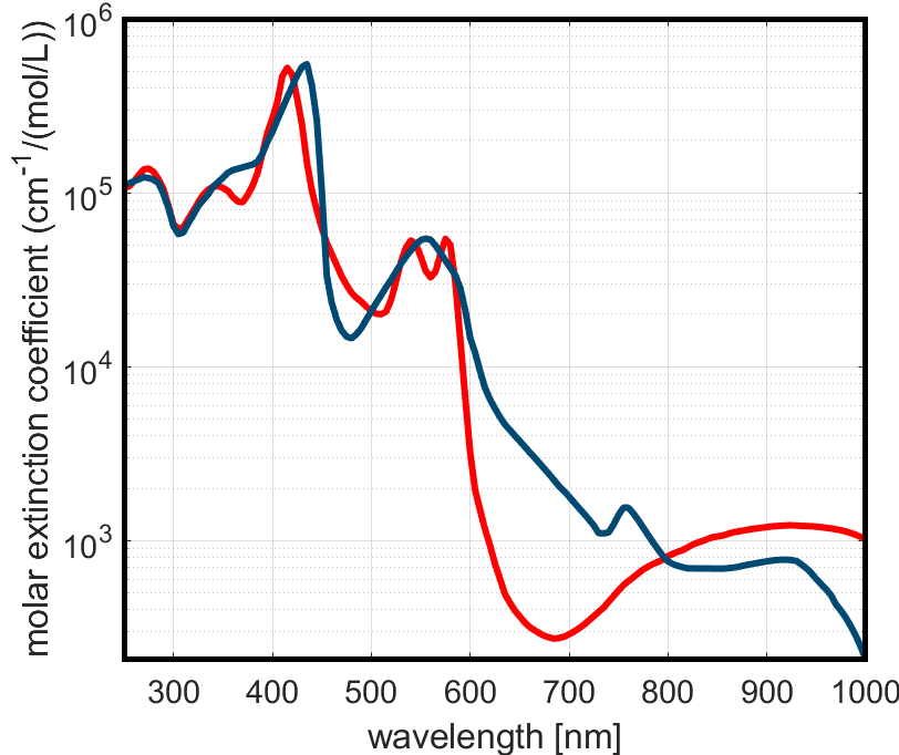 Absorption spectra of oxy- (red) and deoxy-haemoglobin (blue), adapted from Prahl et al. (1993). Strong peaks in the green-yellow and blue regions explain why violet shifts from the Biuret reagent can be hard to see, as haemoglobin absorbs most of the visible spectrum, especially where you’d want your purple to shine through.
