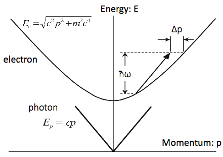 This is a plot of the free electron and photon dispersion relations in free space, or how their energies look like at any given momentum. (The rules are set: if the particle has an energy, it has a specific momentum, and vice versa). Note that, because of the way the electrons dispersion relation is curvy shaped, there's just no way to take a given photon line and successfully slap it on the electrons curve. It always comes up short.